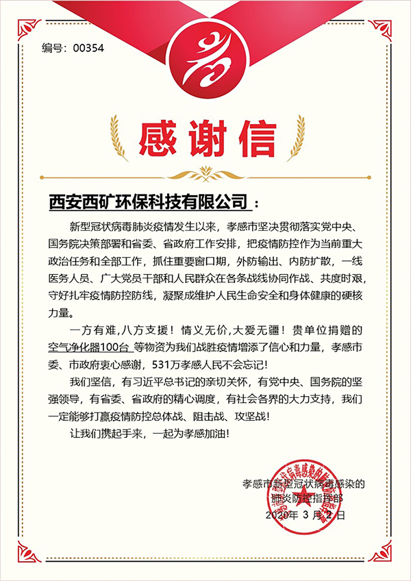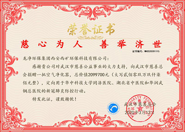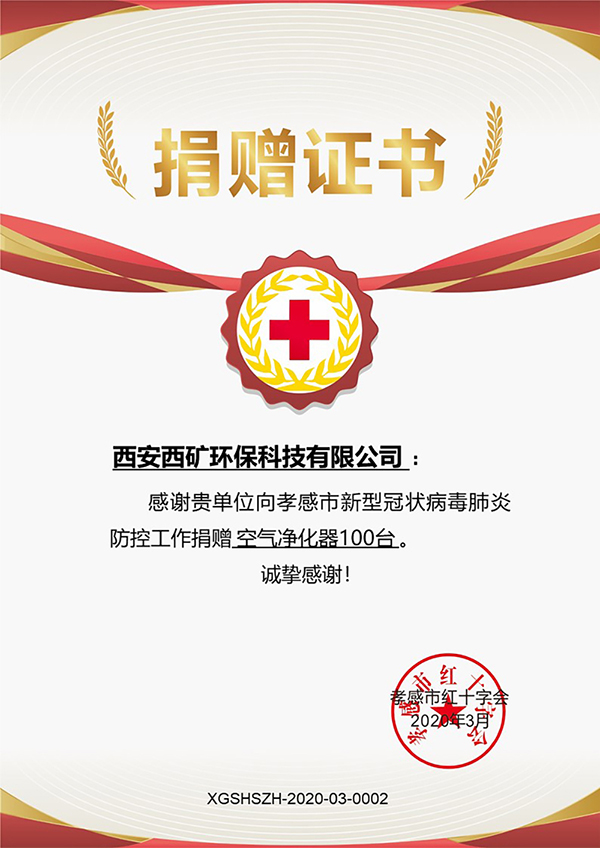 守望相助,使命擔(dān)當(dāng)。自西礦環(huán)保向湖北各地醫(yī)院捐贈(zèng)500臺(tái)“龍凈”牌空氣凈化器以來,公司陸續(xù)收到了武漢市慈善總會(huì)頒發(fā)的“慈心為人 善舉濟(jì)世”榮譽(yù)證書、孝感市紅十字會(huì)發(fā)來的捐贈(zèng)證書等,這些都是對(duì)西礦環(huán)保愛心捐贈(zèng)的充分肯定。